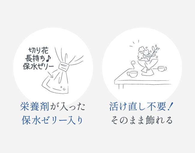 特別な器や花瓶が不要で、そのまま自立するデザインのため、受け取ったその瞬間から、簡単に飾ることができます。