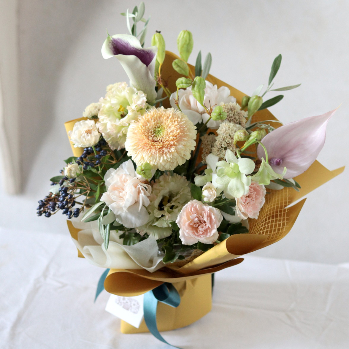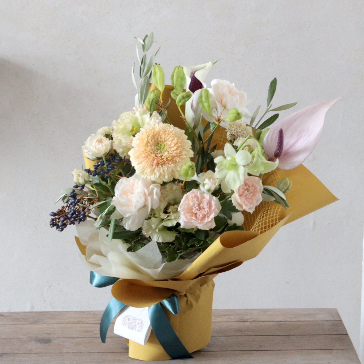 大切な人へ、ぬくもりの気持ちを届けるブーケに仕立てました。