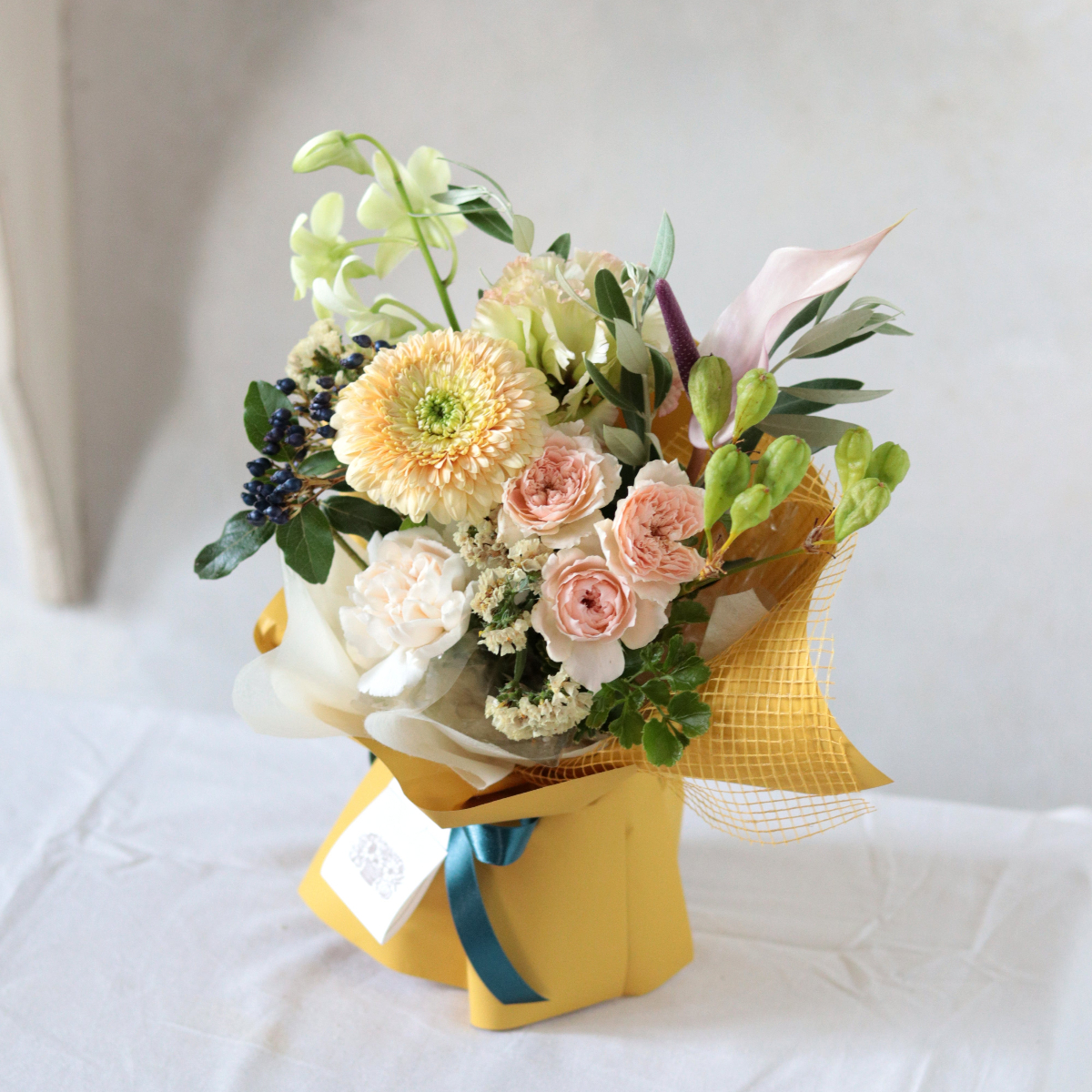 大切な人へ、ぬくもりの気持ちを届けるブーケに仕立てました。