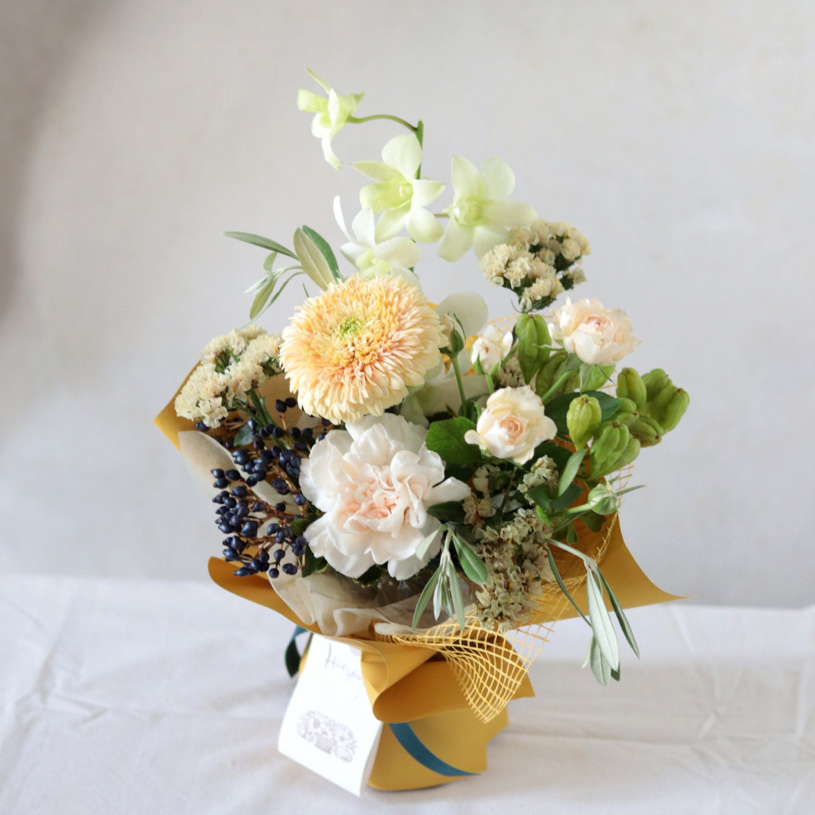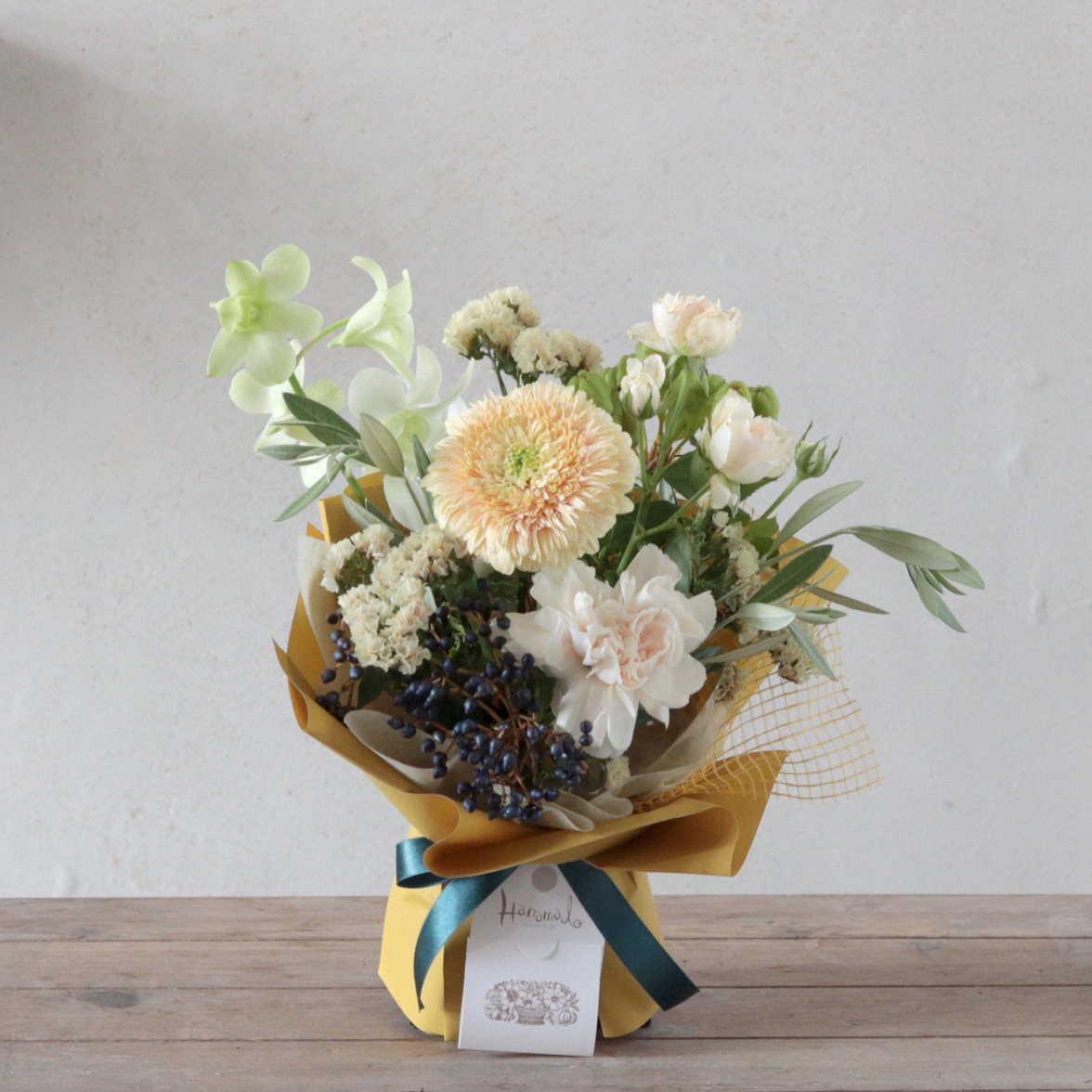クリーム色の花々を、やさしい黄色のラッピングでふんわりと。