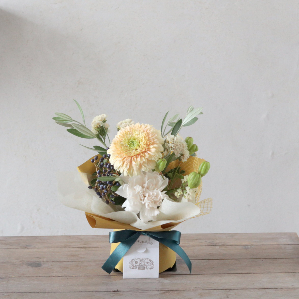 クリーム色の花々を、やさしい黄色のラッピングでふんわりと。