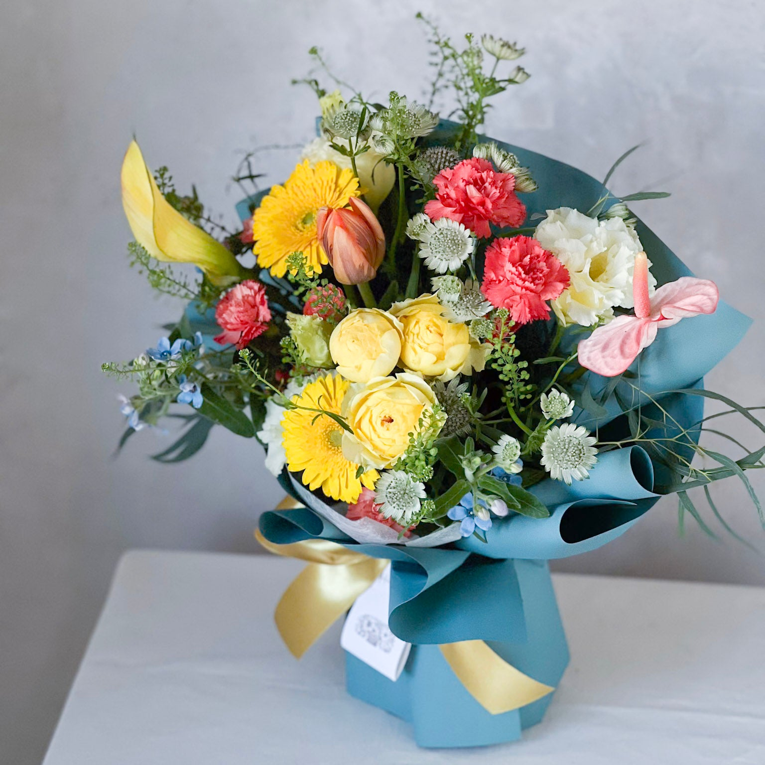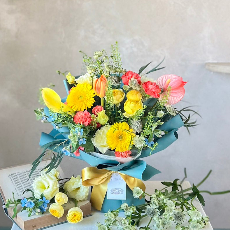 明るさが日々をそっと支えてくれます。花言葉に重ねて、大切な人へ、そっと元気な気持ちを届けるブーケに仕立てました。