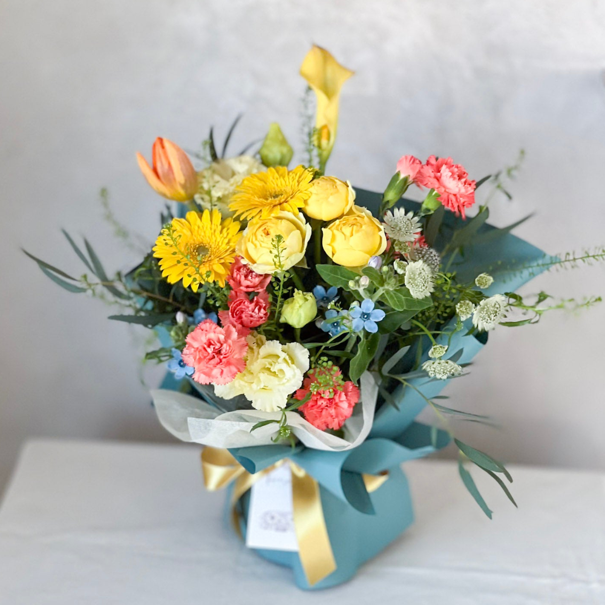 明るさが日々をそっと支えてくれます。花言葉に重ねて、大切な人へ、そっと元気な気持ちを届けるブーケに仕立てました。