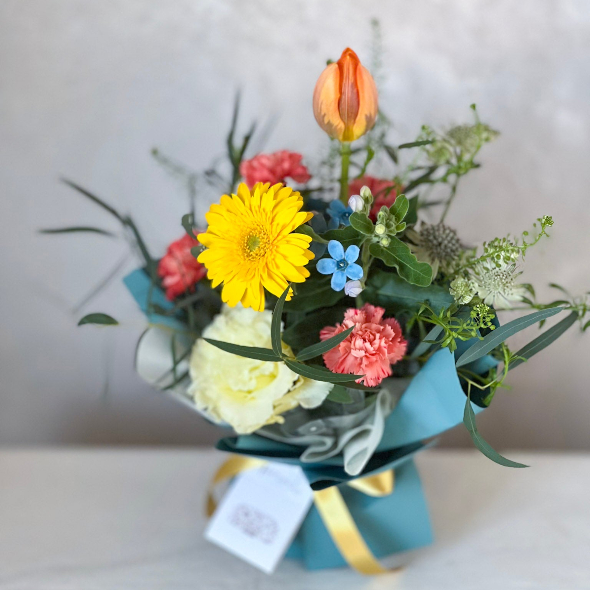 明るさが日々をそっと支えてくれます。花言葉に重ねて、大切な人へ、そっと元気な気持ちを届けるブーケに仕立てました。