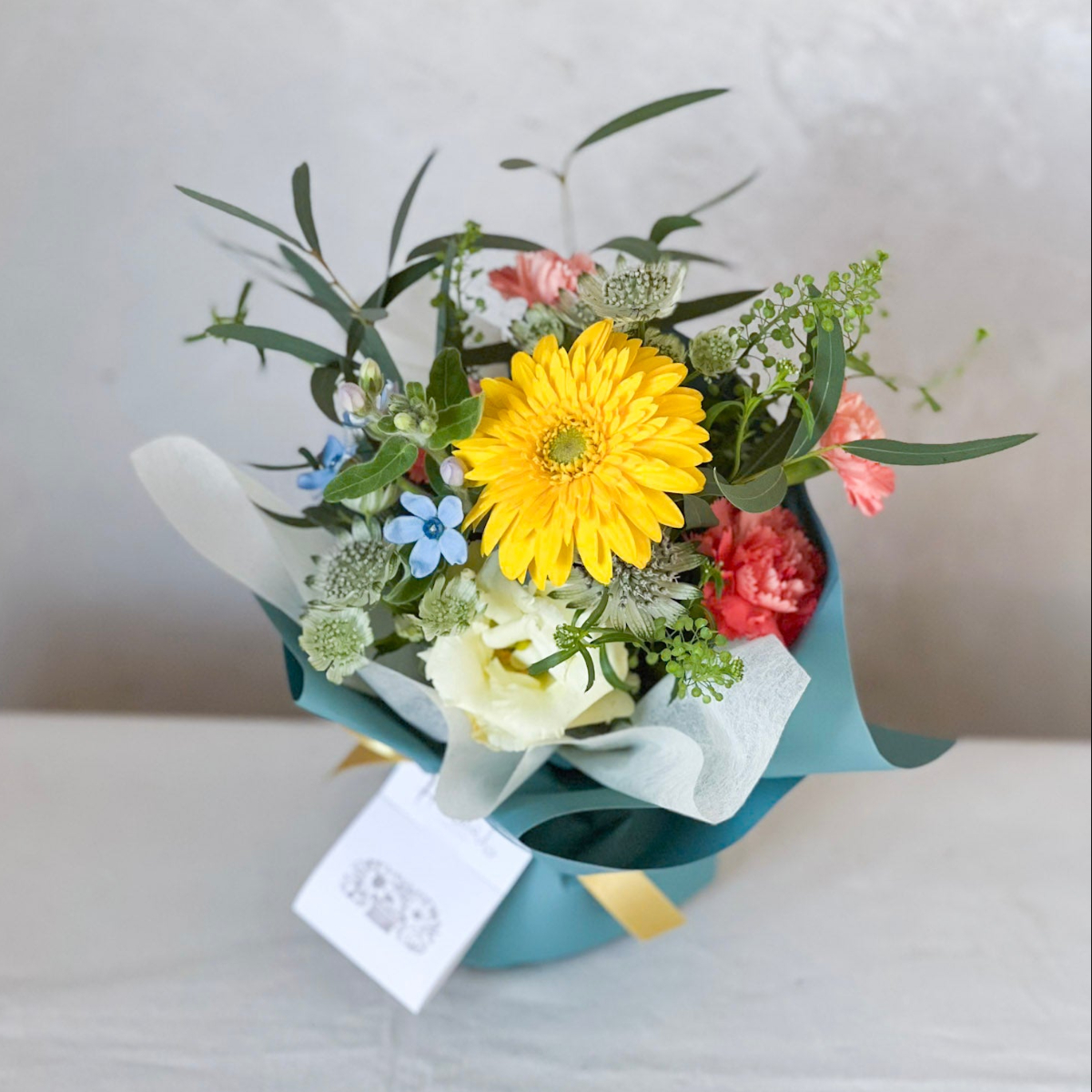 明るさが日々をそっと支えてくれます。花言葉に重ねて、大切な人へ、そっと元気な気持ちを届けるブーケに仕立てました。