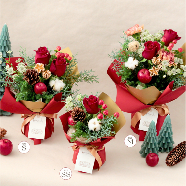 深紅のバラをメインに、ブルーバアイズやヒムロスギなどのグリーン、コットン、マツカサなどを合わせて華やかに仕上げました。