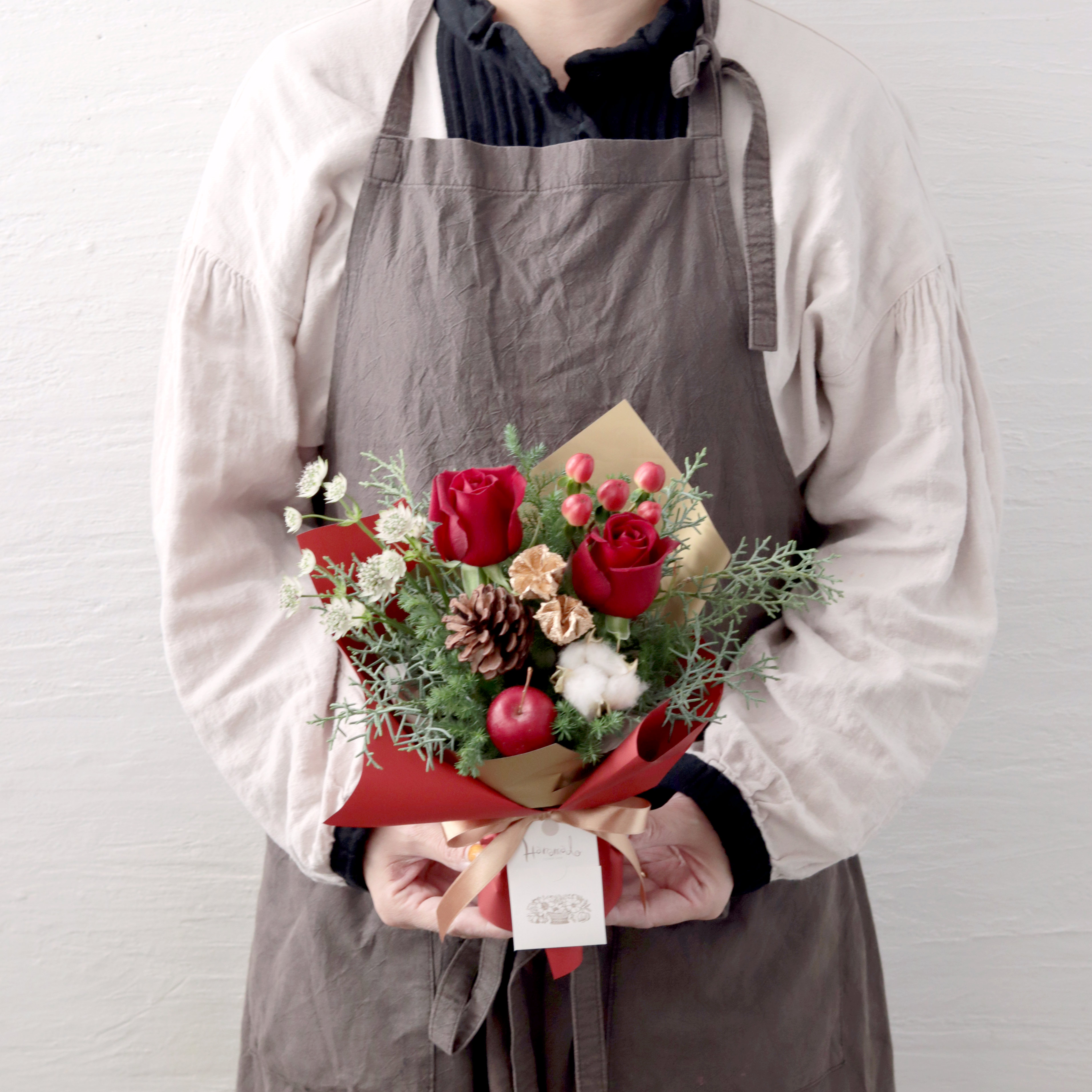 深紅のバラをメインに、ブルーバアイズやヒムロスギなどのグリーン、コットン、マツカサなどを合わせて華やかに仕上げました。
