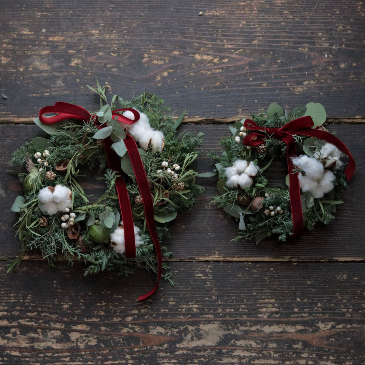 ドライになるヒバやスギなどの針葉樹を使って、ドアや壁に掛けるリースです。 どんなお家の雰囲気にも合わせやすく落ち着いた色合いのデザインです。 きほくのもり★ペンタスさんのふんわりコットンを詰め込んだ リースをお家に迎えてクリスマス気分を。 ▼サイズ 直径:約28cm 花材:ヒムロスギ、ブルーバード、ブルーバード、ユーカリ、コットン、実もの、木の実など
