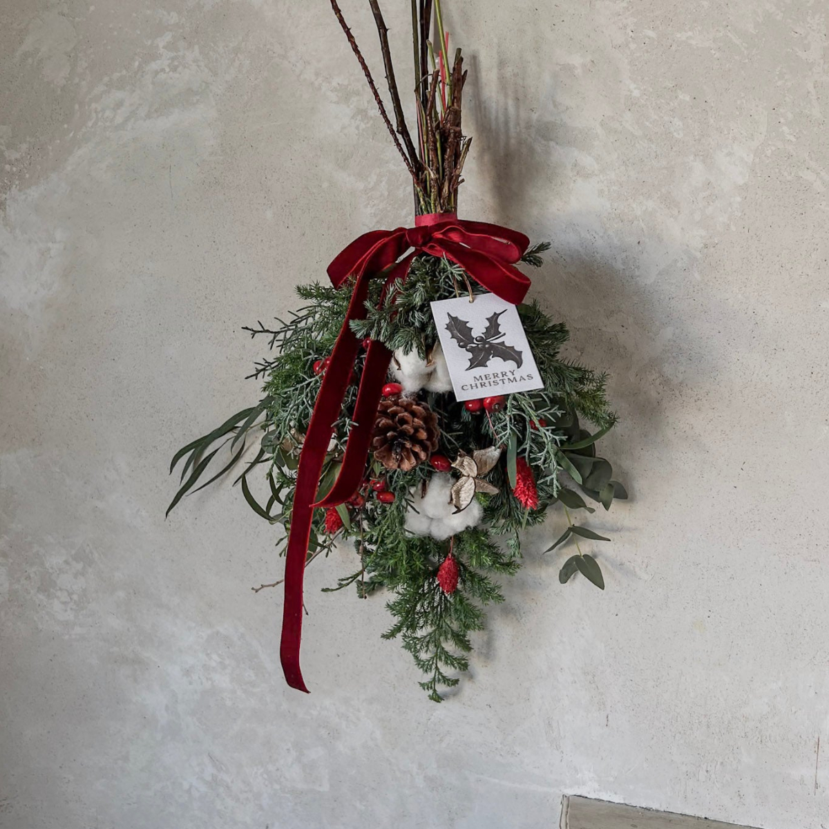 ドライになる針葉樹を使って、ドアや壁に掛けるスワッグです。